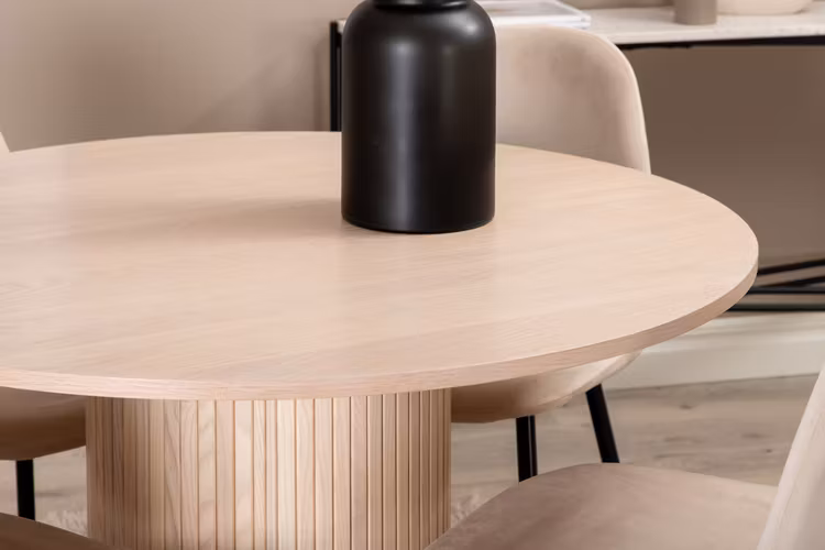 Möblera vardagsrummet modernt och mysigt med en charmig rund matgrupp! Kring vårt matbord Bianca skapar du en härlig gemenskap där ingen riskerar hamna på kanten. Bordsskivan är tillverkad i MDF och har en cylinderformad stomme i robust utformning och ribbad design. Den genomgående putsade vita kulören är lika tidlös som snygg och enkel att matcha med övrig inredning. Bordets mått: Diameter: 110cm, Höjd: 74cm. Här i läcker kombination av 4st vita Polar matstolar i beige sammetstyg med utsvängda stolsben i svart metall. Stolens mått: Höjd: 87cm, Sitthöjd: 45,5cm, Bredd: 44cm, Djup: 53cm.
