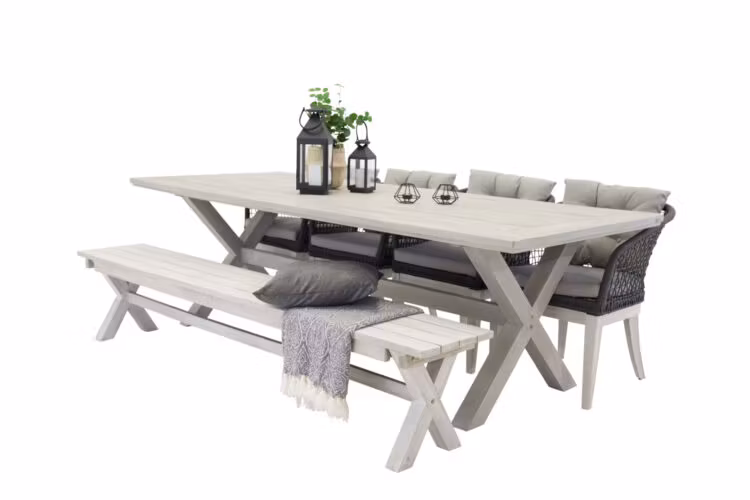 Stilren kryssbänk för utomhusbruk från serien Rives, tillverkad av Akacia med smakfull vit finish. Den här tresits bänken fungerar utmärkt om extra sittplatser behövs runt matbordet eller som solitär detalj längs den soliga husväggen. Den klassiska designen gör att bänken upplevs inbjudande, charmig och tidlös. Komplettera med matgrupp från samma serie så skapar du en matchande helhet på din uteplats!